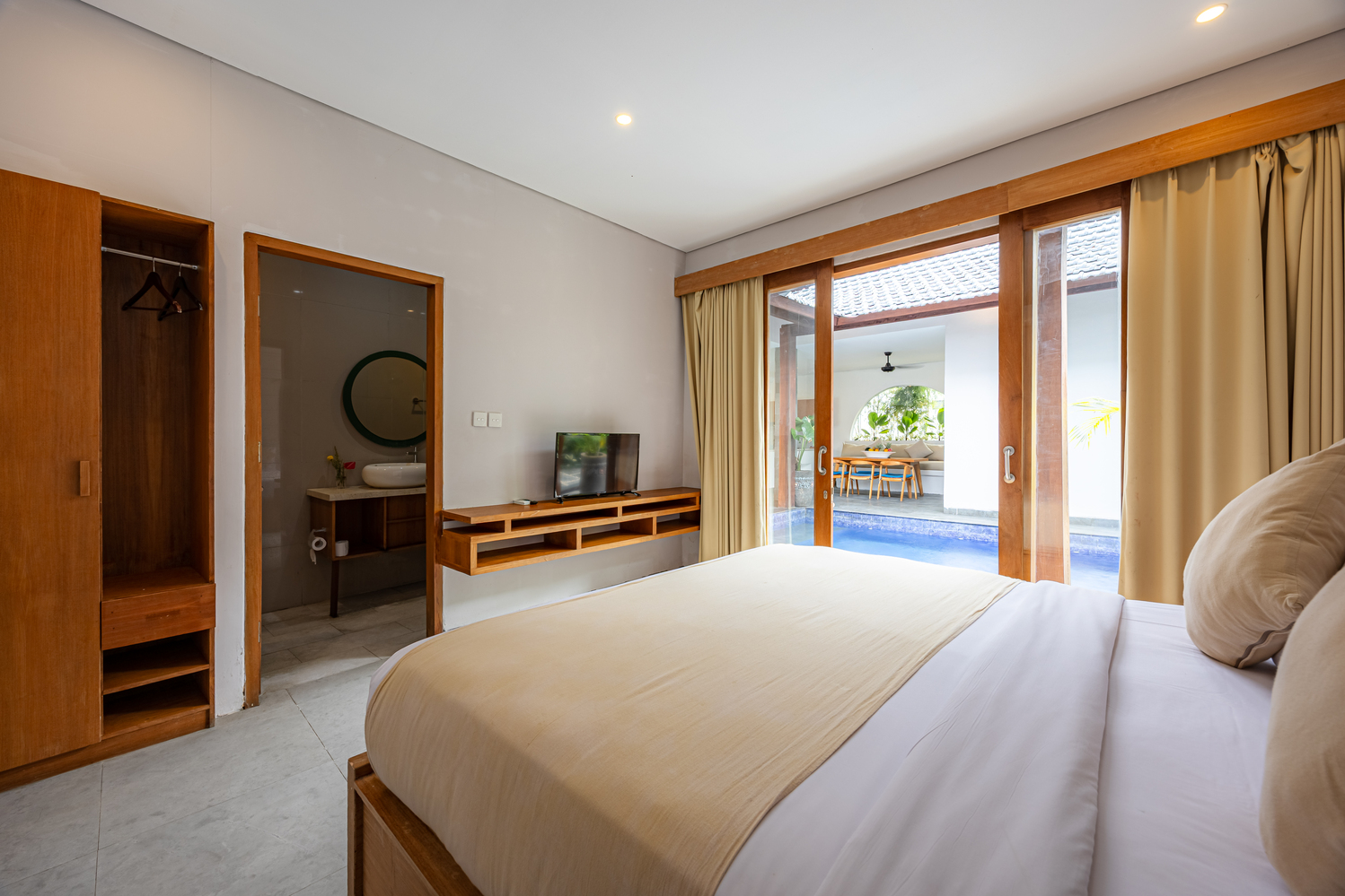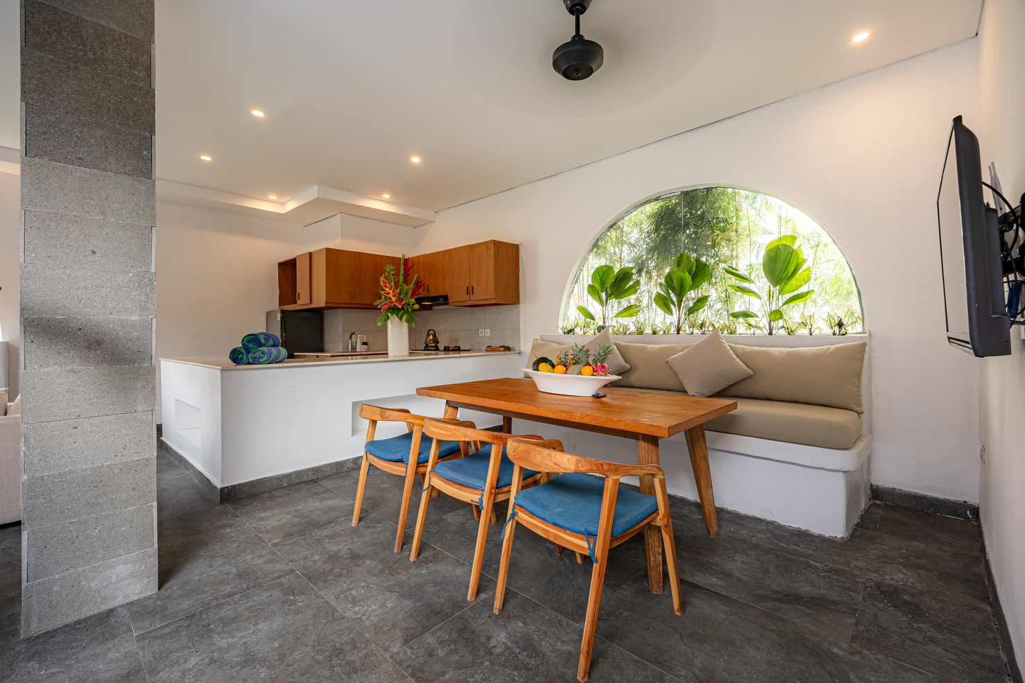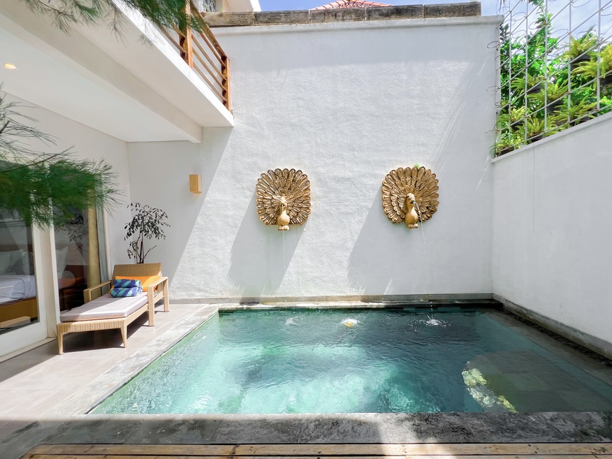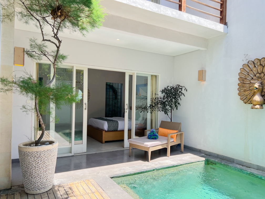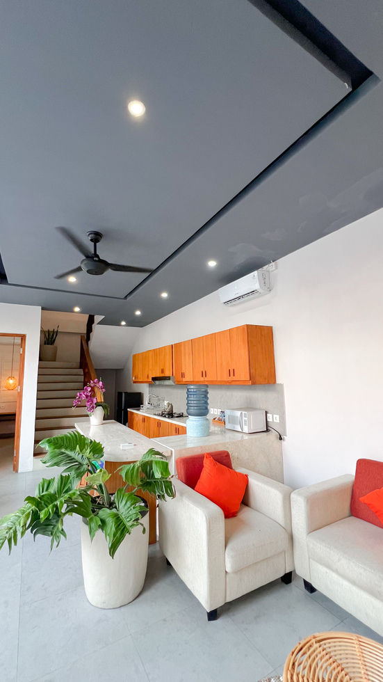 Apple Villa unit is fitted with flat screen satellite TV, DVD player and air conditioning, it also equipped with terrace & private pool and seating area. There is a full kitchen with microwave, refrigerator, toaster, complete with dining area, fully kitchen utensils. Outdoor furniture featuring a shower. The guest can enjoy pool view and tropical garden.
