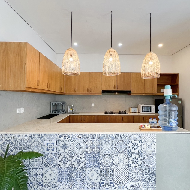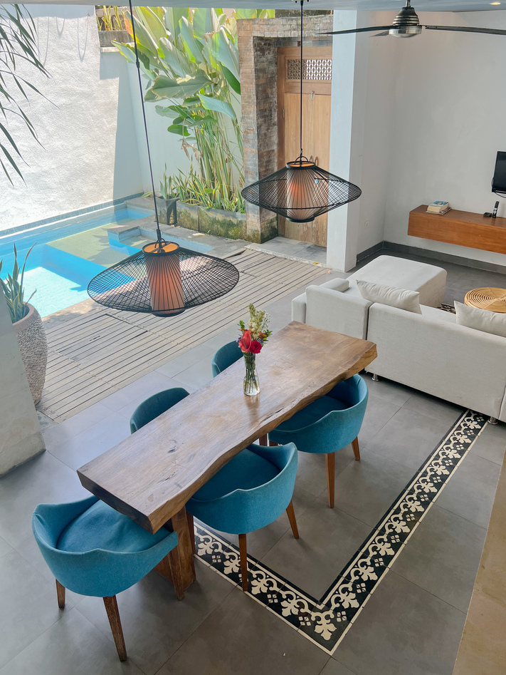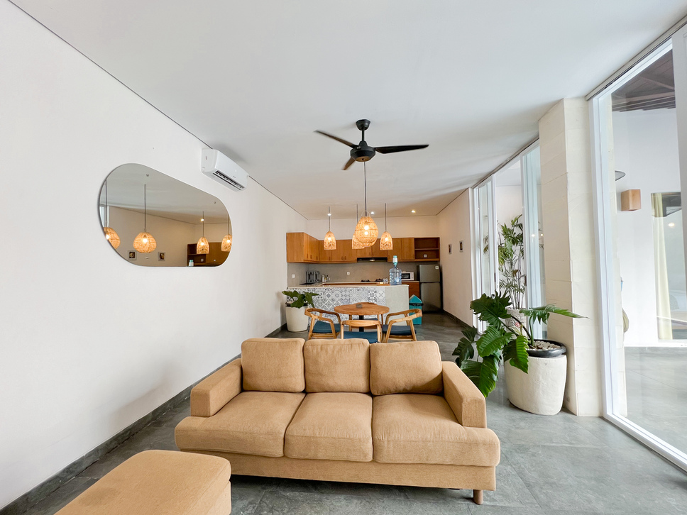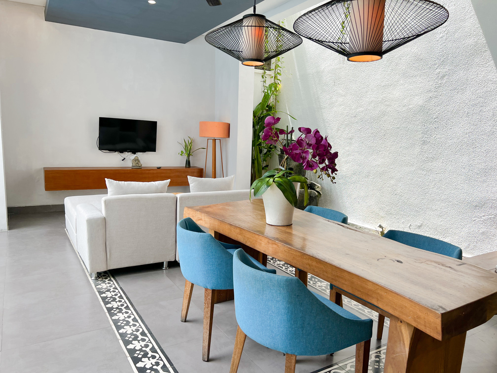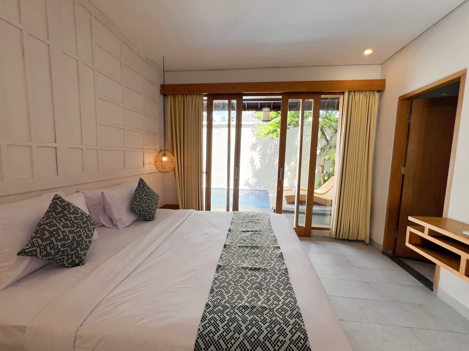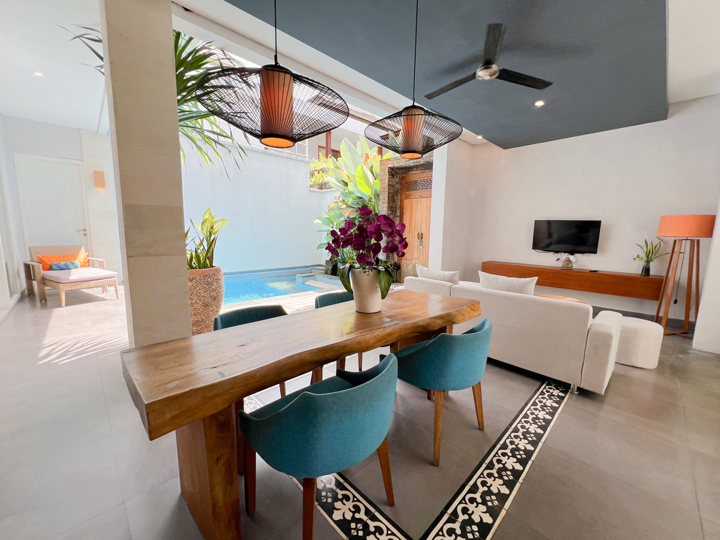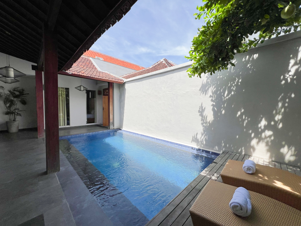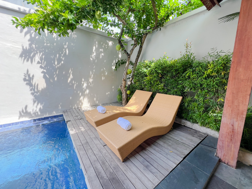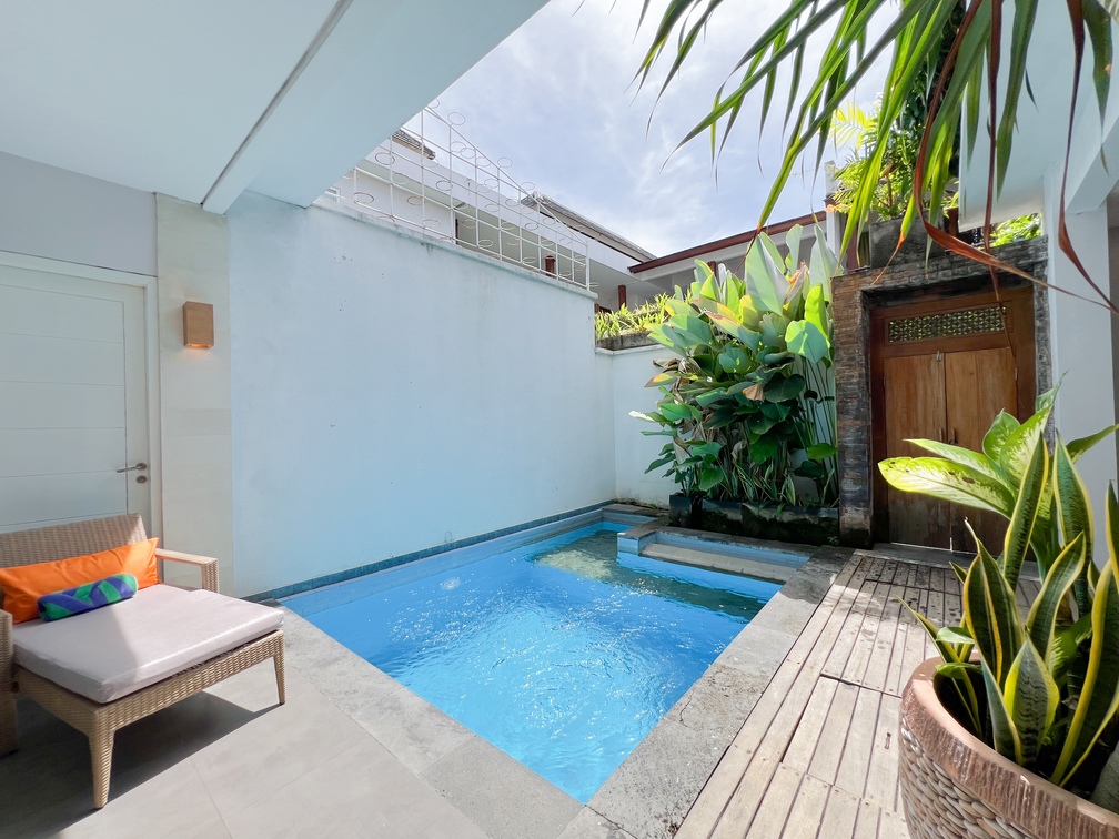 2 Bedrooms villa boast well-furnished accommodation with private pool supported by minimalist design, cozy living area downstairs with modern fusion. Second floor Bedroom and private bathroom with hot and normal water.